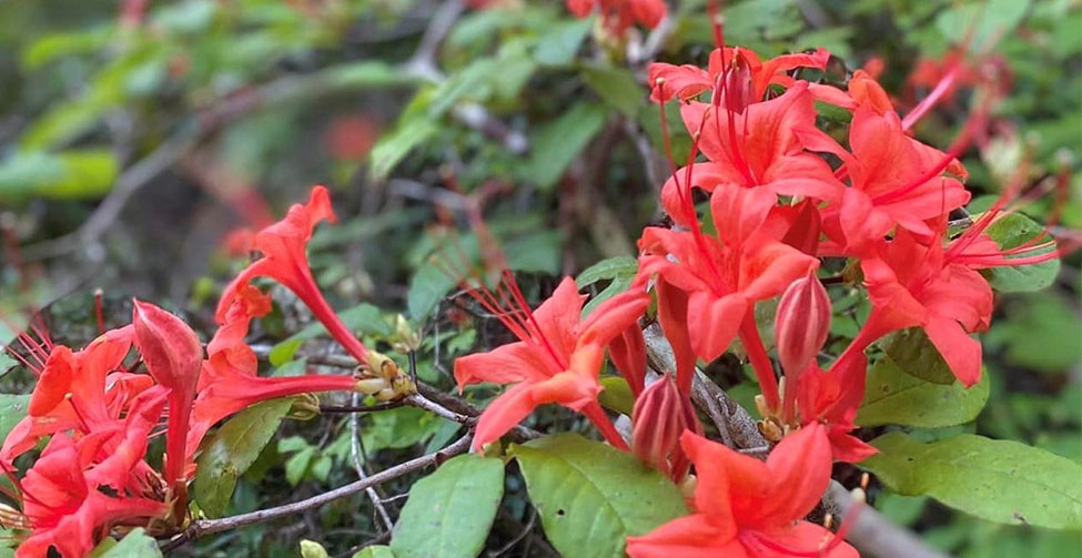 One Georgia native azalea of note is the rare plumleaf azalea, whose natural range is limited to southwest Georgia and eastern Alabama. The bright orange blooms of this threatened plant can be enjoyed in July and August along the trails at F.D. Roosevelt and Providence Canyon state parks.